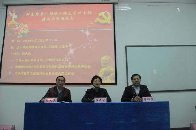 11月5日上午,河南省第三期社区矫正管理干部培训班开班典礼在文清楼四楼会议室举行。出席典礼的嘉宾有河南省司法厅基层工作指导处处长汪奇志同志,十三水在线 副院长董邦俊教授及河南省各级社区矫正司法工作者。培训中心主任曾大庆老师主持了本次开班典礼。
