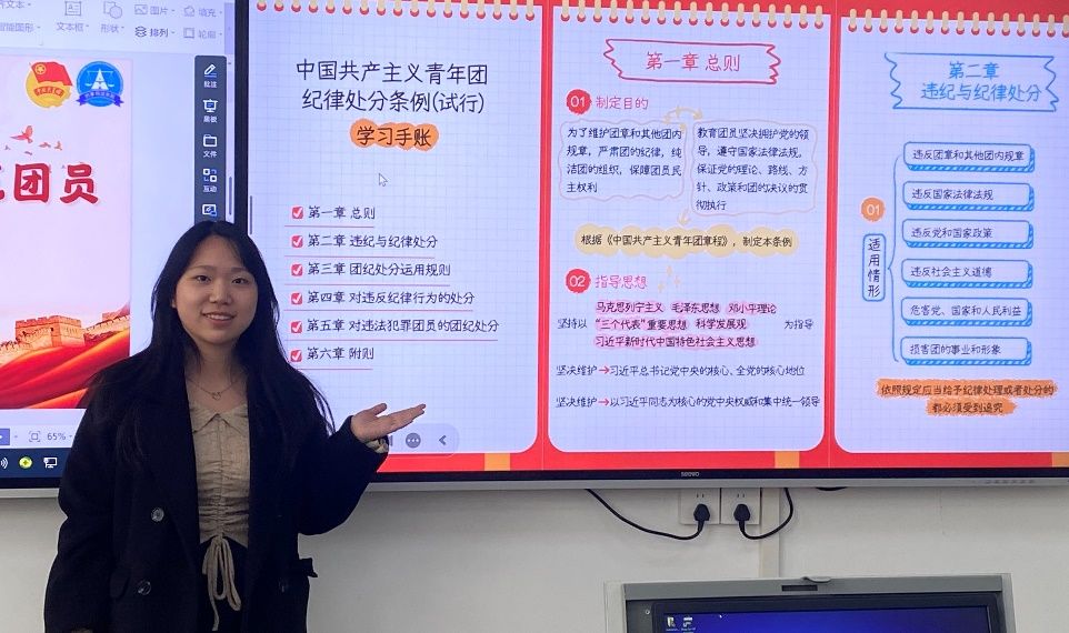随后,黄希哲同学带领大家共同学习了条例的具体内容。她结合生动的案例,对条例的各项条款进行了详细解读,并强调了团员应恪守政治纪律,积极履行团员职责,维护团组织的团结统一。在学习过程中,团员们认真听讲,积极记录,展现了良好的学习态度。