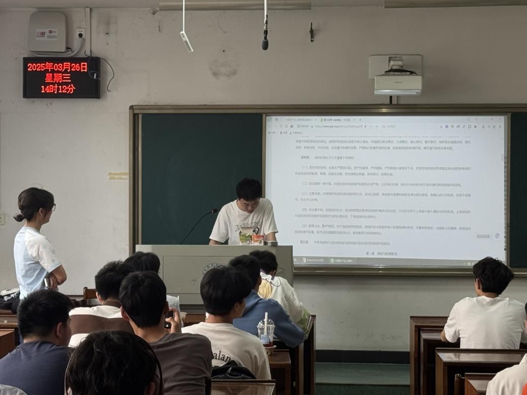 活动伊始,团支书蒋承洋强调了《条例》学习的重要意义。她指出,新时代的共青团员肩负着民族复兴的历史使命,应将纪律要求转化为内在行动。学习团纪处分条例能帮助团员明辨是非界限,规范日常言行,为同学们成长为合格的社会主义建设者和接班人奠定基础。