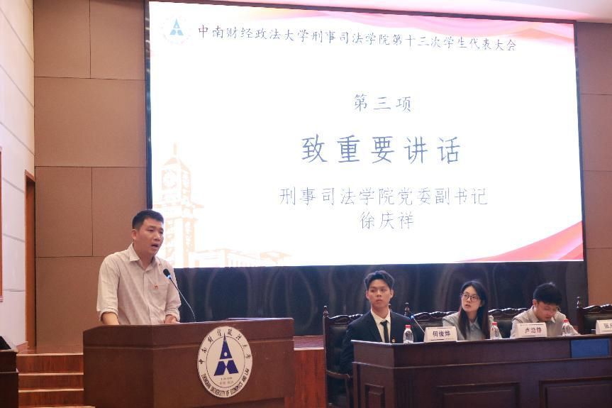 大会开幕式第二项,校学生会主席团成员郭馨瑶致开幕词。郭馨瑶希望各位代表坚定信心,振奋精神,以开拓创新的胆识魄力,锲而不舍的执着干劲,求真务实的工作作风,在实践中继续弘扬“聚是一团火,散是满天星”的刑司精神,为高质量推进学校“双一流”建设贡献刑司力量!