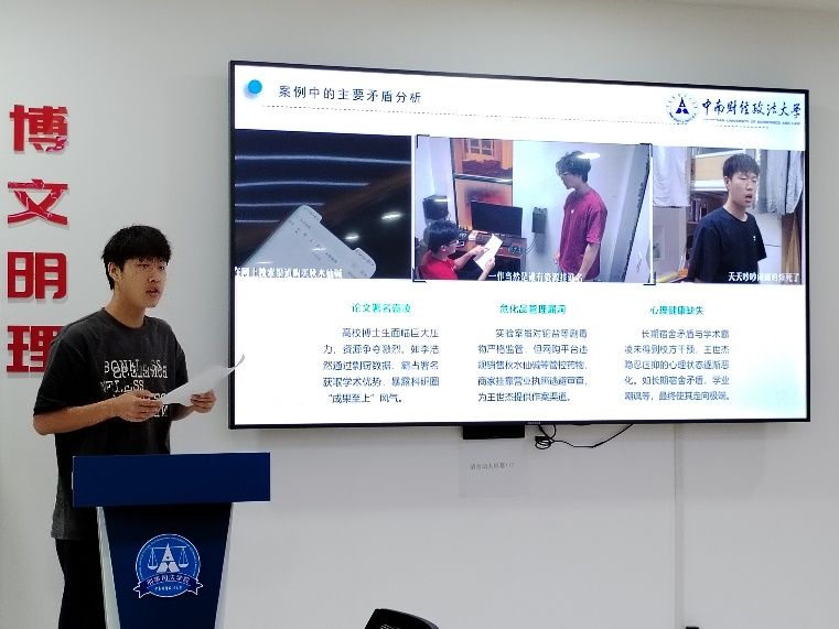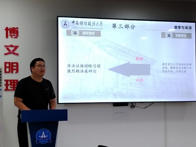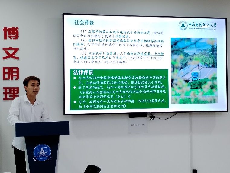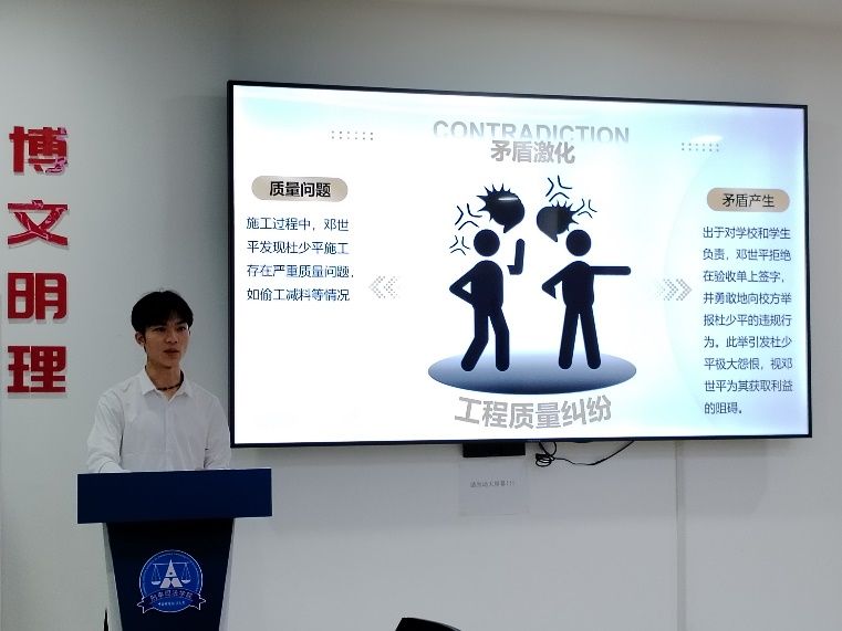 最后是南湖猎罪支队的代表同学以“受害者遭受校园霸凌后正当防卫”这一社会关注度高的话题,强调了法律与人情相结合,破除“谁伤谁有利”的旧观念的重要性。