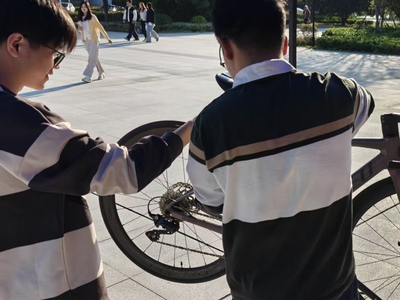活动期间,志愿者们凭借专业维修技能与热情服务态度,对每一辆“就诊”自行车开展全方位检查。从轮胎气压检测、刹车系统调试,到链条润滑保养、零部件紧固加固,志愿者们细致排查每一处细节,全力确保车辆恢复最佳使用状态。维修间隙,志愿者还主动向车主讲解自行车日常养护知识,涵盖定期清洁的必要性、刹车系统检查技巧、轮胎保养重点及润滑油正确使用方法等内容,切实帮助师生提升车辆自主维护能力。