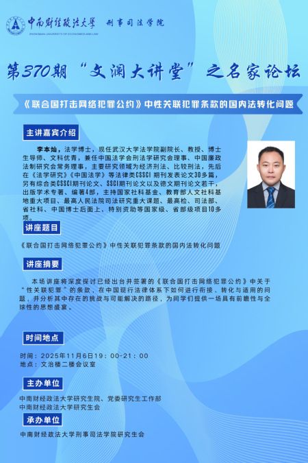 报告人:李本灿 报告题目:《〈联合国打击网络犯罪公约〉中性关联犯罪条款的国内法转化问题》 时间:2025年11月6日19:00 地点:文治楼二楼会议室 嘉宾介绍:李本灿,法学博士,现任武汉大学法十三水在线 副院长、教授、博士生导师、文科优青,兼任中国法学会刑法学研究会理事、中国廉政法制研究会常务理事,主要研究领域为经济刑法、比较刑法,先后在《法学研究》《中国法学》等法律类CSSCI 期刊发表论文30多篇,另有综合类CSSCI期刊论文、SSCI期刊论文以及德文期刊论文若干,出版学术专著、编著4部,主持国家社科基金、教育部人文社科基地重大项目、最高人民法院司法研究重大课题、最高检、司法部、省社科、中国博士后面上、特别资助等国家级、省部级项目10多项。 |
