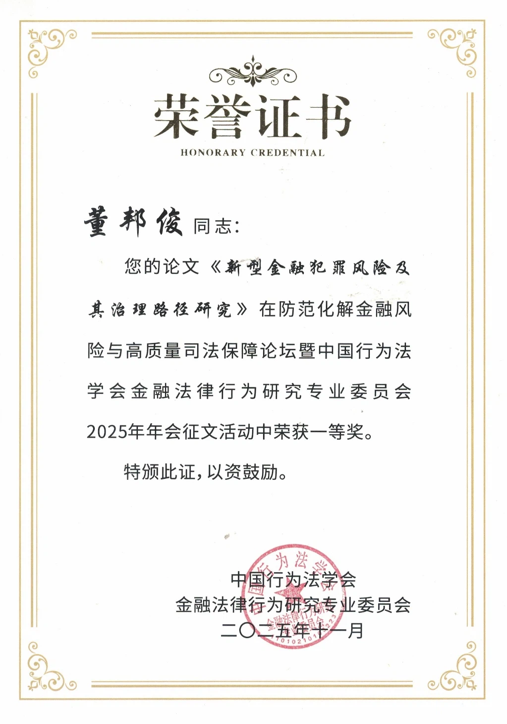 院长董邦俊教授的论文《新型金融犯罪风险及其治理路径研究》荣获征文一等奖。